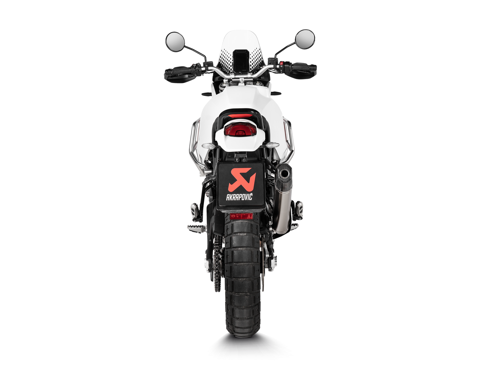 Scutul termic, conceput complet de la zero, oferă protecție pentru pasager și echipament, în timp ce conferă un aspect unic. Creșterile de putere de 1,8 kW (2,4 CP) la 9.400 rpm și ale cuplului de 1,8 Nm la 8.100 rpm – comparativ cu un Ducati DesertX echipat cu sistemul standard și testat pe dinamometrul propriu Akrapovič – se combină cu un răspuns al accelerației impecabil.