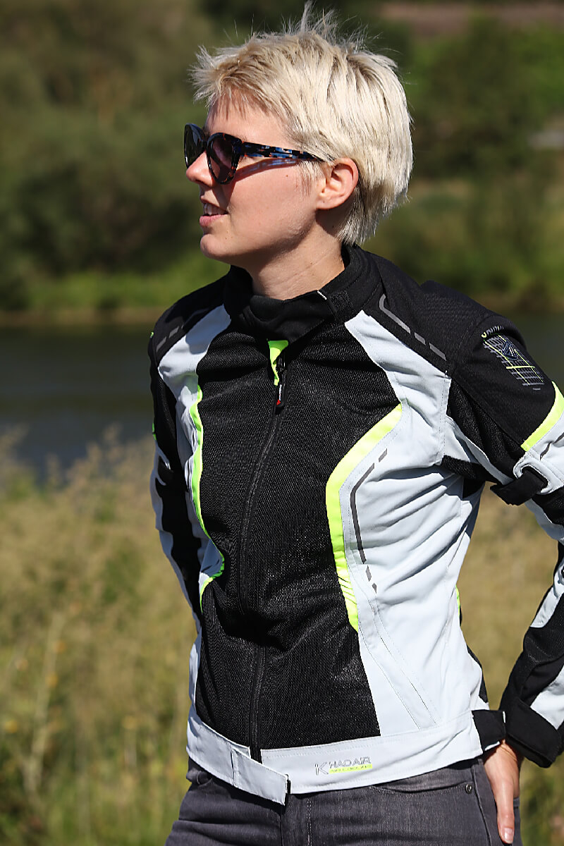 Khao Air Lady promite cea mai bună ventilație în zilele uscate de vară datorită utilizării generoase a zonelor din plasă. Membrana (detașabilă) vă menține uscat pe vreme umedă. Jacheta este super ușoară, cu o potrivire scurtă atletică, în talie.