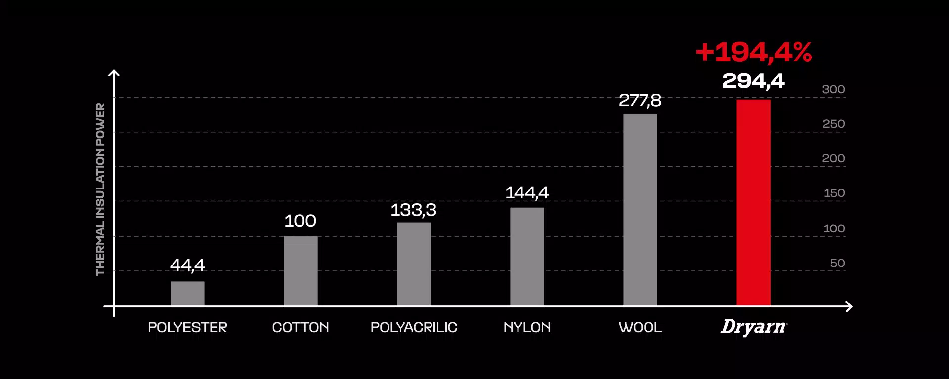 Dryarn oferă o izolare excelentă. Acest lucru se datorează faptului că are cea mai mică conductivitate termică dintre toate fibrele, oferind astfel cea mai bună izolare împotriva mediului exterior. Dryarn creează o barieră respiratorie care izolează și transportă transpirația din interior spre exterior. O barieră izolatoare și protectoare care, de asemenea, respiră pentru a se asigura că pielea rămâne uscată; caldă iarna și răcoroasă vara.
