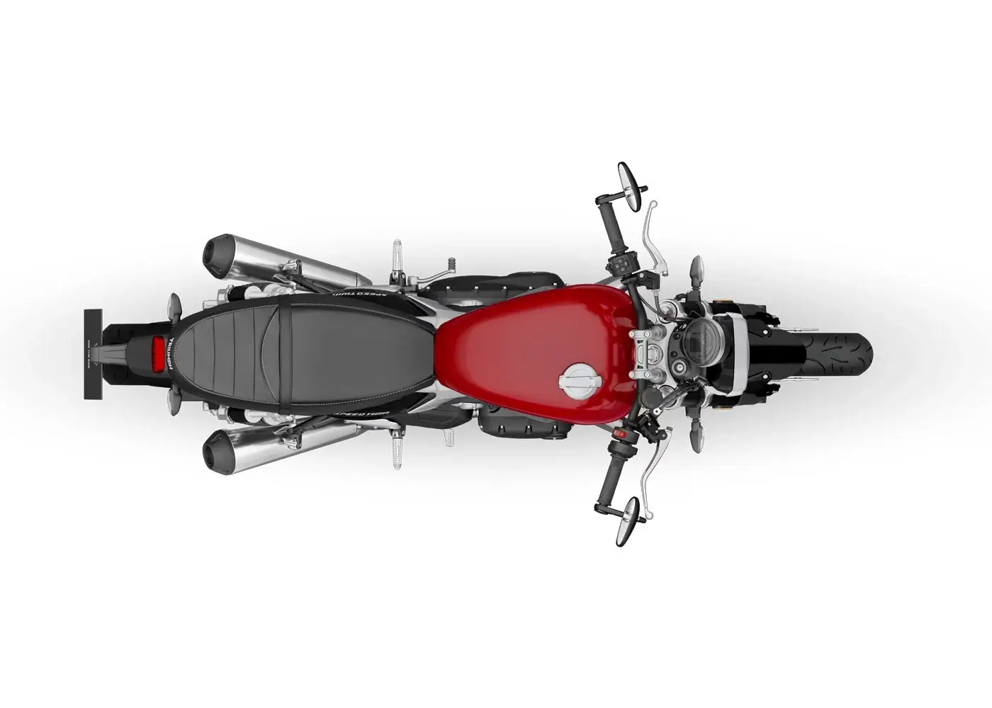 Cu un design minimalist și elegant, Speed Twin 1200 atrage toate privirile. Rezervorul înclinat, cu decupaje adânci, este sculptat și puternic, iar capacele corpului de accelerație, finisate în aluminiu periat, se integrează perfect în panourile laterale. Carcasele motorului, negre și unghiulare, sunt încadrate de o evacuare fluidă care duce la cele două tobe ridicate de tip „megafon”, oferind o notă distinctă și puternică.