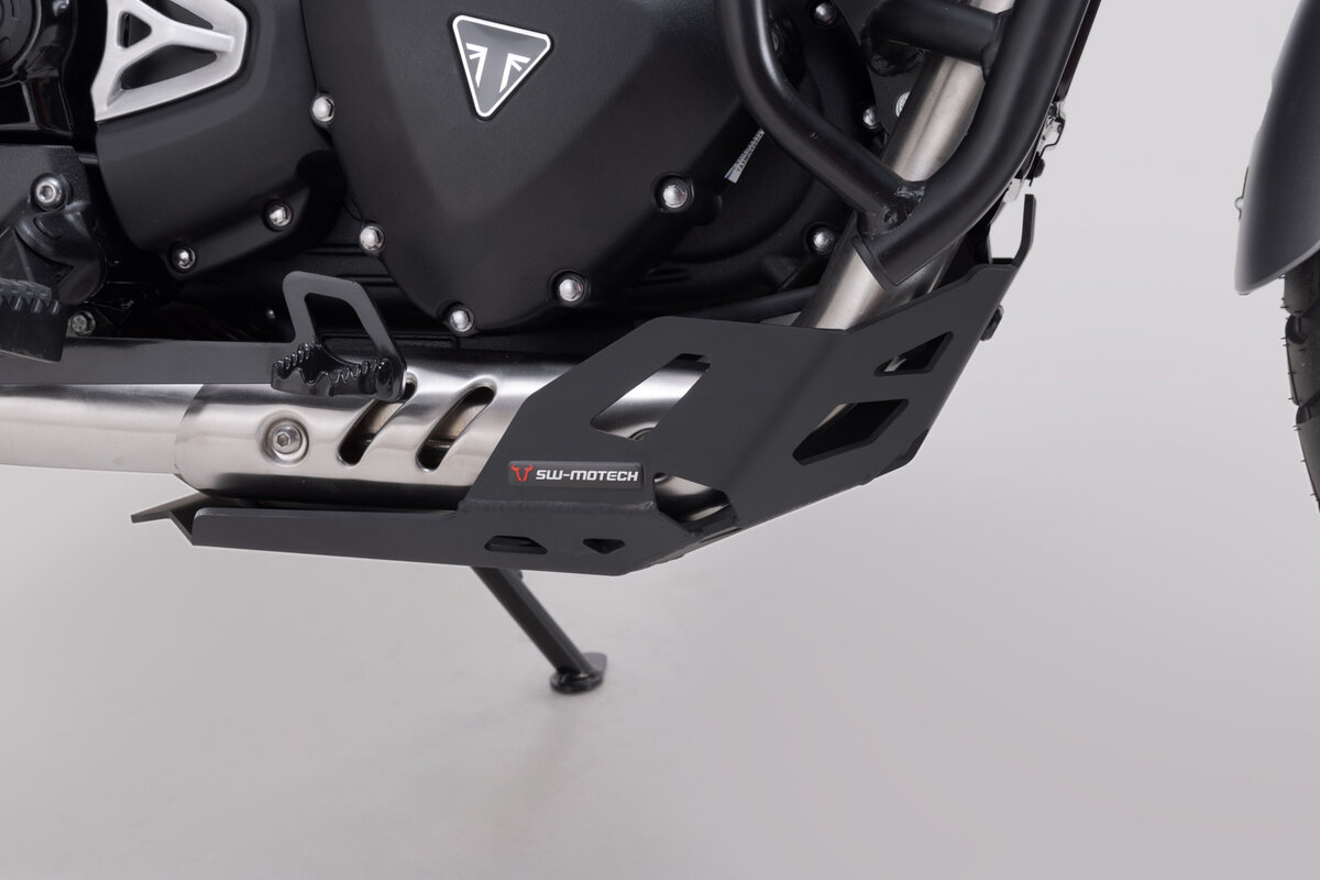 Scutul de motor robust oferă protecție suplimentară pentru motor și rezervorul din plastic al Triumph Scrambler 400 X. Tablă de aluminiu de 4 mm grosime, realizată din aliaj de aluminiu de înaltă calitate, poate proteja motorul împotriva ciobiturilor de pietre și zgârieturilor în cazul în care motocicleta intră în contact cu solul. Astfel, oferă siguranță sporită și un aspect individualizat.